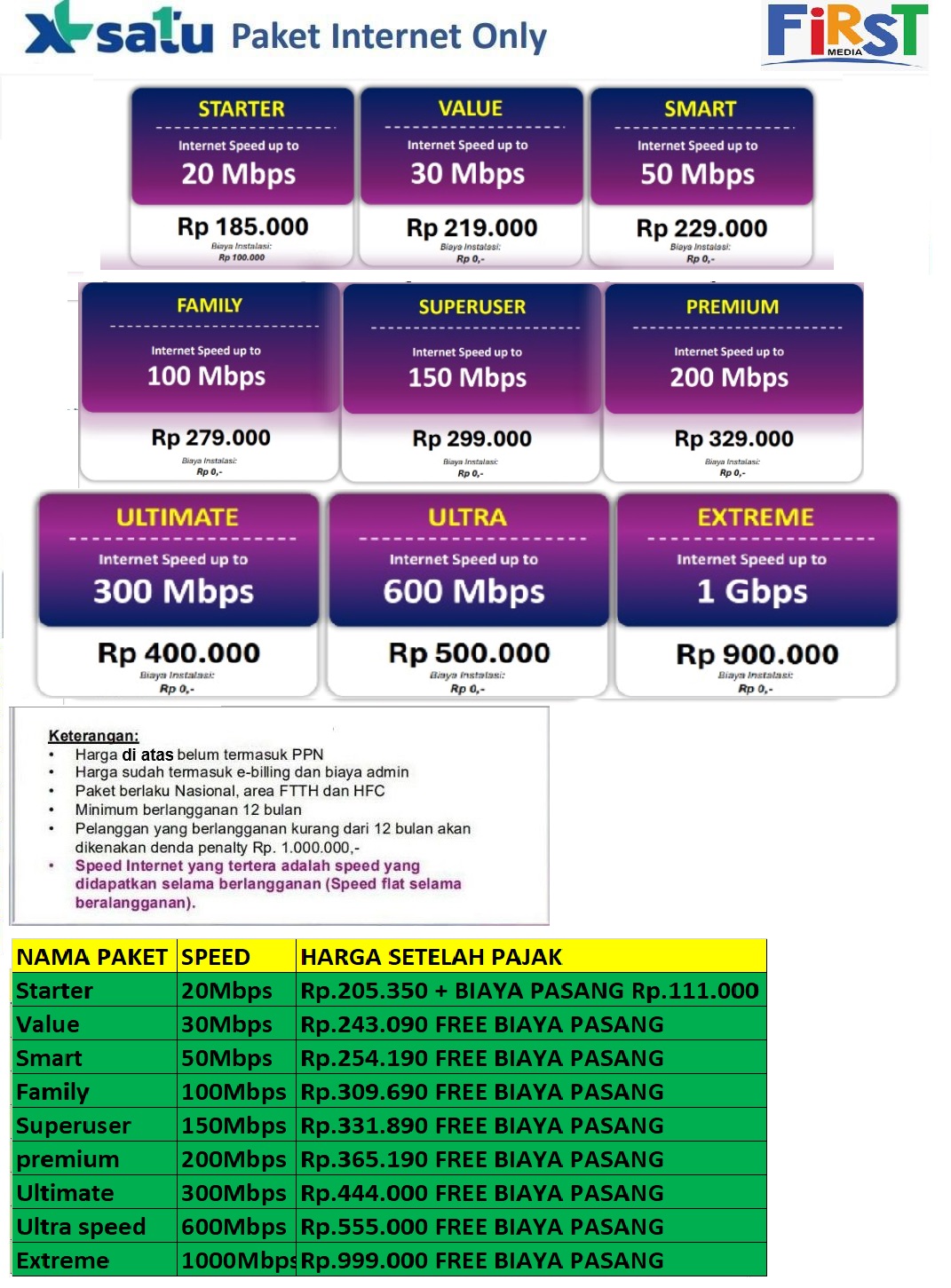 Harga diatas adalah biaya berlangganan per bulan termasuk biaya dasar paket dan sewa perangkat Modem Router dan layanan streaming FirstMediaX